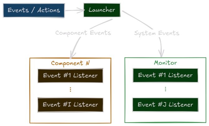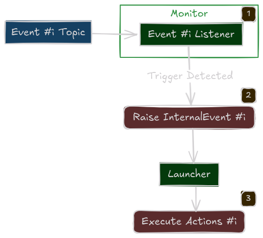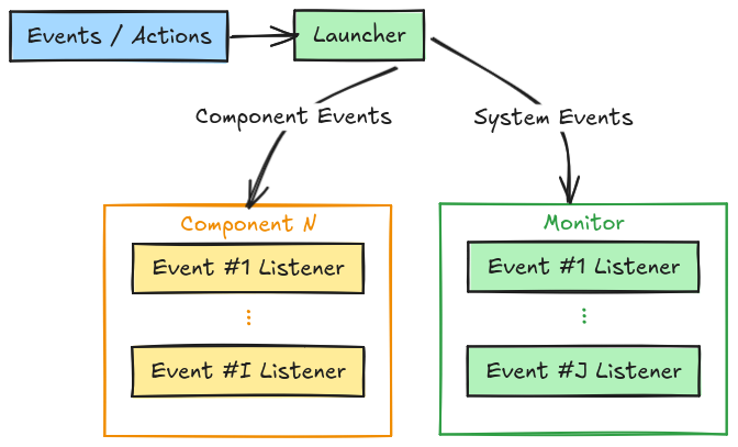 Under the hood, every Launcher spawns an internal Monitor node. This hidden “Brain” is responsible for tracking component health, listening for events, and executing the orchestration logic.